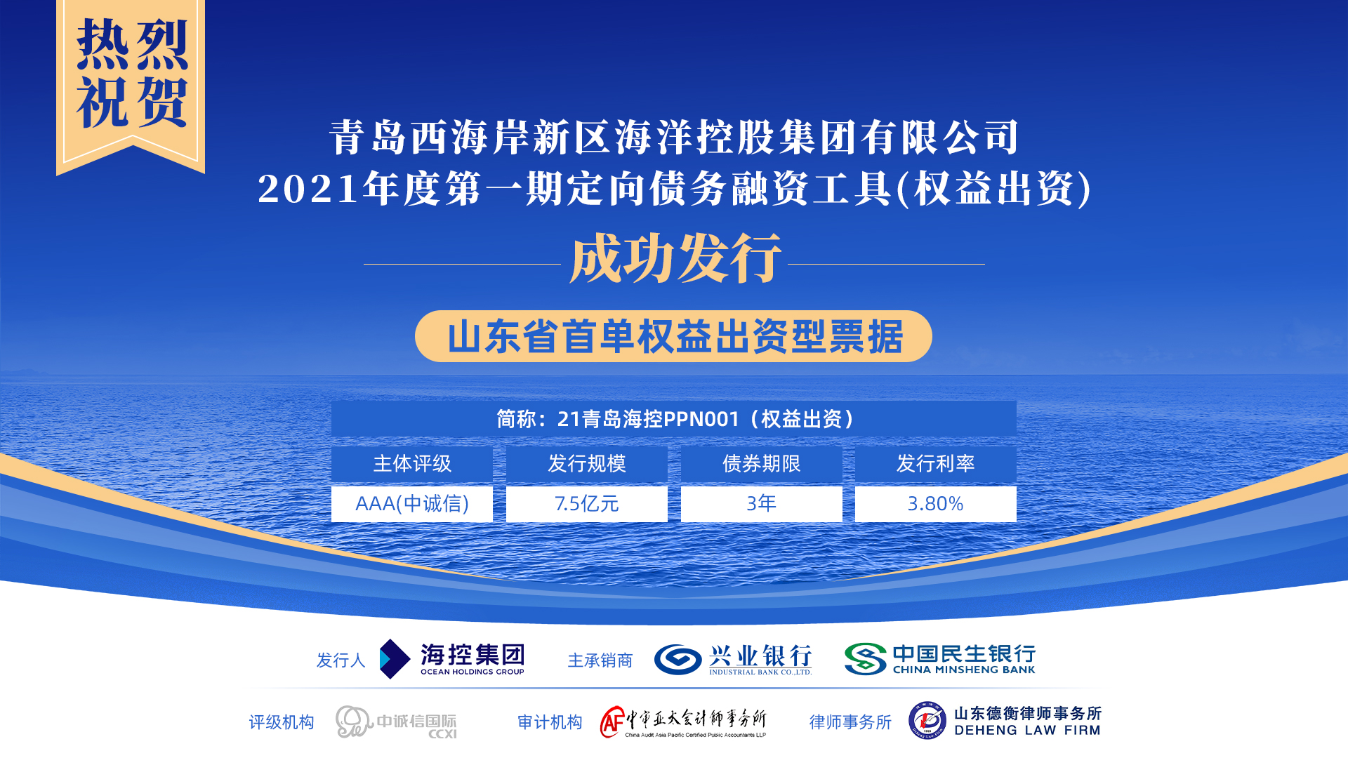 近日,“青島西海岸新區(qū)海洋控股集團有限公司2021年度第一期定向債務(wù)融資工具(權(quán)益出資)”成功發(fā)行,發(fā)行金額7.5億元,期限3年,為山東省首單權(quán)益出資型票據(jù)。