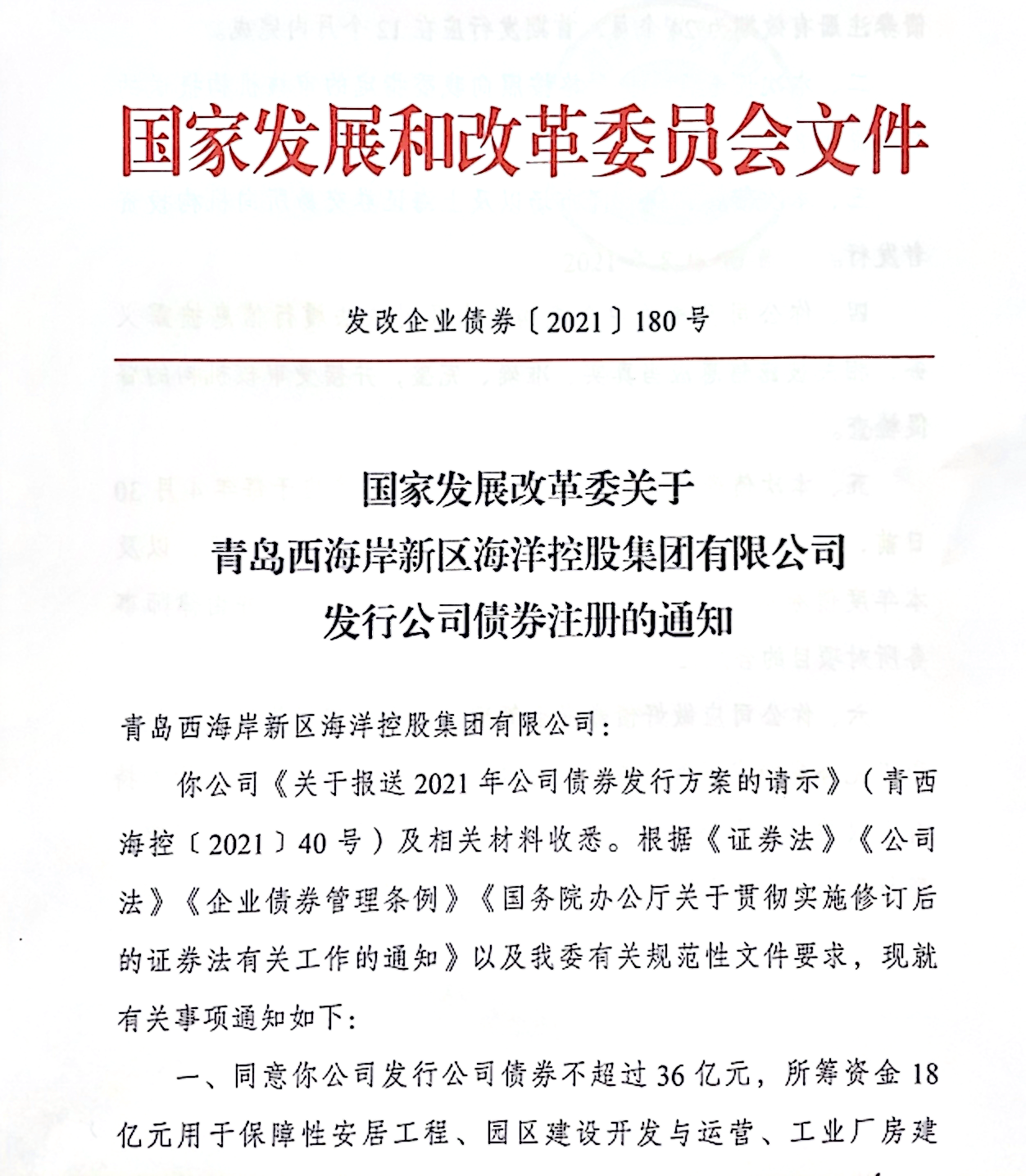 8月30日,??丶瘓F(tuán)成功獲得國(guó)家發(fā)展和改革委員會(huì)優(yōu)質(zhì)企業(yè)債批復(fù),額度36億元,標(biāo)志著青島市第一支優(yōu)質(zhì)企業(yè)債券成功獲批。