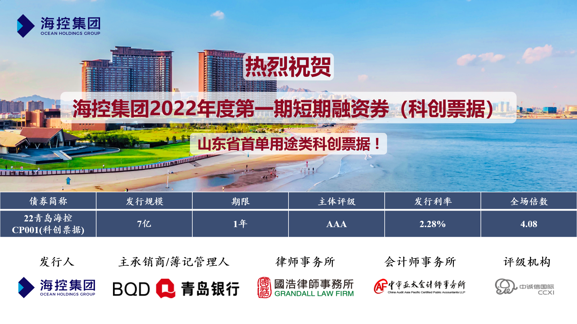 近日,??丶瘓F“2022年度第一期短期融資券(科創(chuàng)票據(jù))”成功發(fā)行,期限1年,發(fā)行金額7億元,認(rèn)購倍數(shù)4.08倍,發(fā)行年利率2.28%,為山東省首單用途類科創(chuàng)票據(jù)。資金主要服務(wù)于青島京東方產(chǎn)業(yè)生產(chǎn)基地和海洋生物醫(yī)藥產(chǎn)業(yè)園區(qū)等科技創(chuàng)新項目建設(shè)。