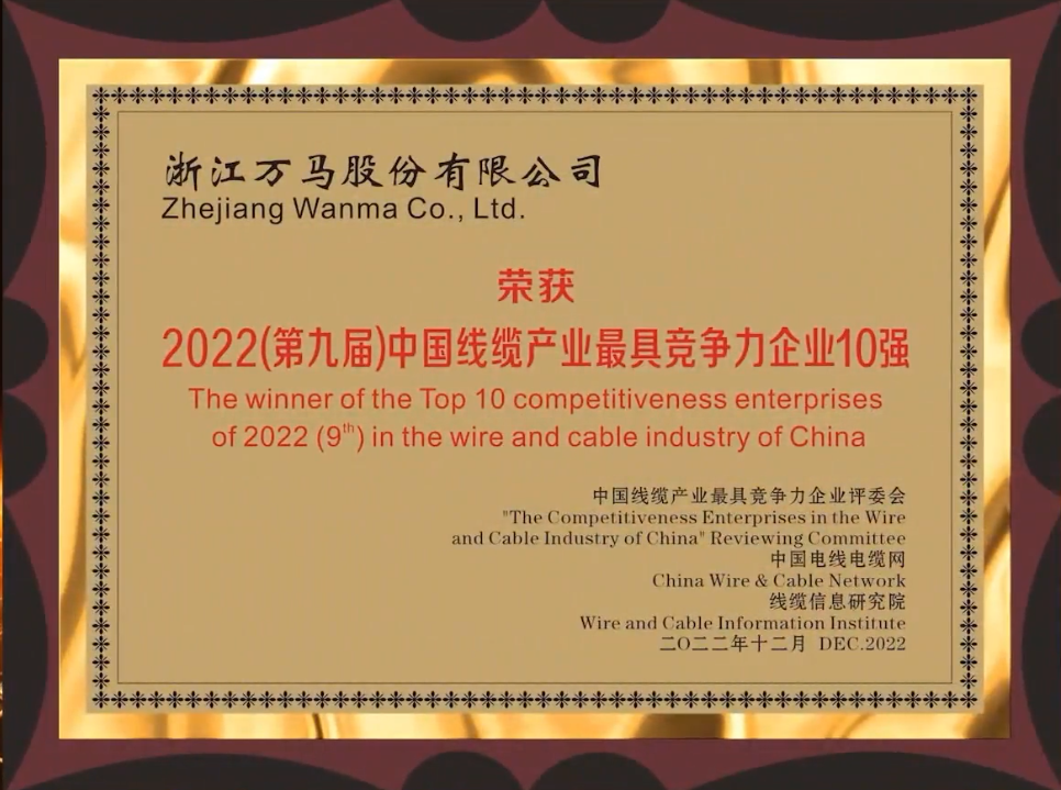 ▲萬馬股份“2022年度中國線纜行業(yè)最具競爭力企業(yè)10強”獎牌