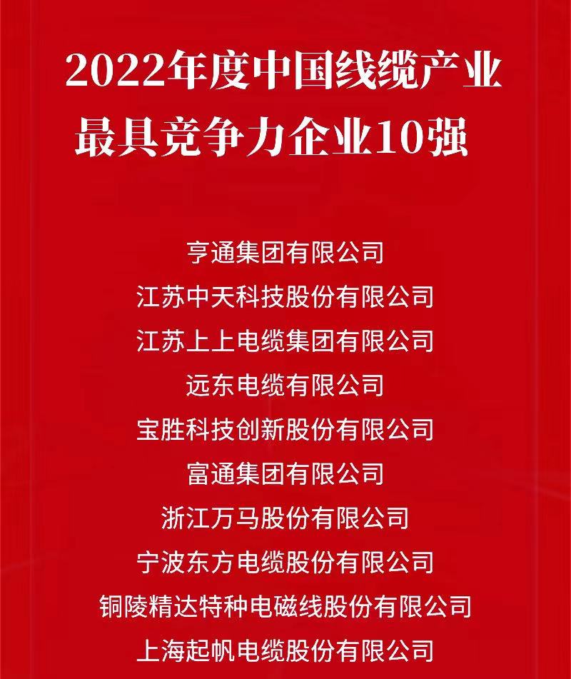 ▲ “2022年度中國線纜行業(yè)最具競爭力企業(yè)10強”榜單