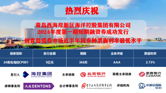 1月19日,??丶瘓F(tuán)成功發(fā)行2024年度第一期短期融資券(24青島??谻P001),募集資金5億元,期限1年,發(fā)行利率為2.73%,認(rèn)購(gòu)倍數(shù)5.72倍,創(chuàng)青島債券市場(chǎng)近半年同券種票面利率最低水平。