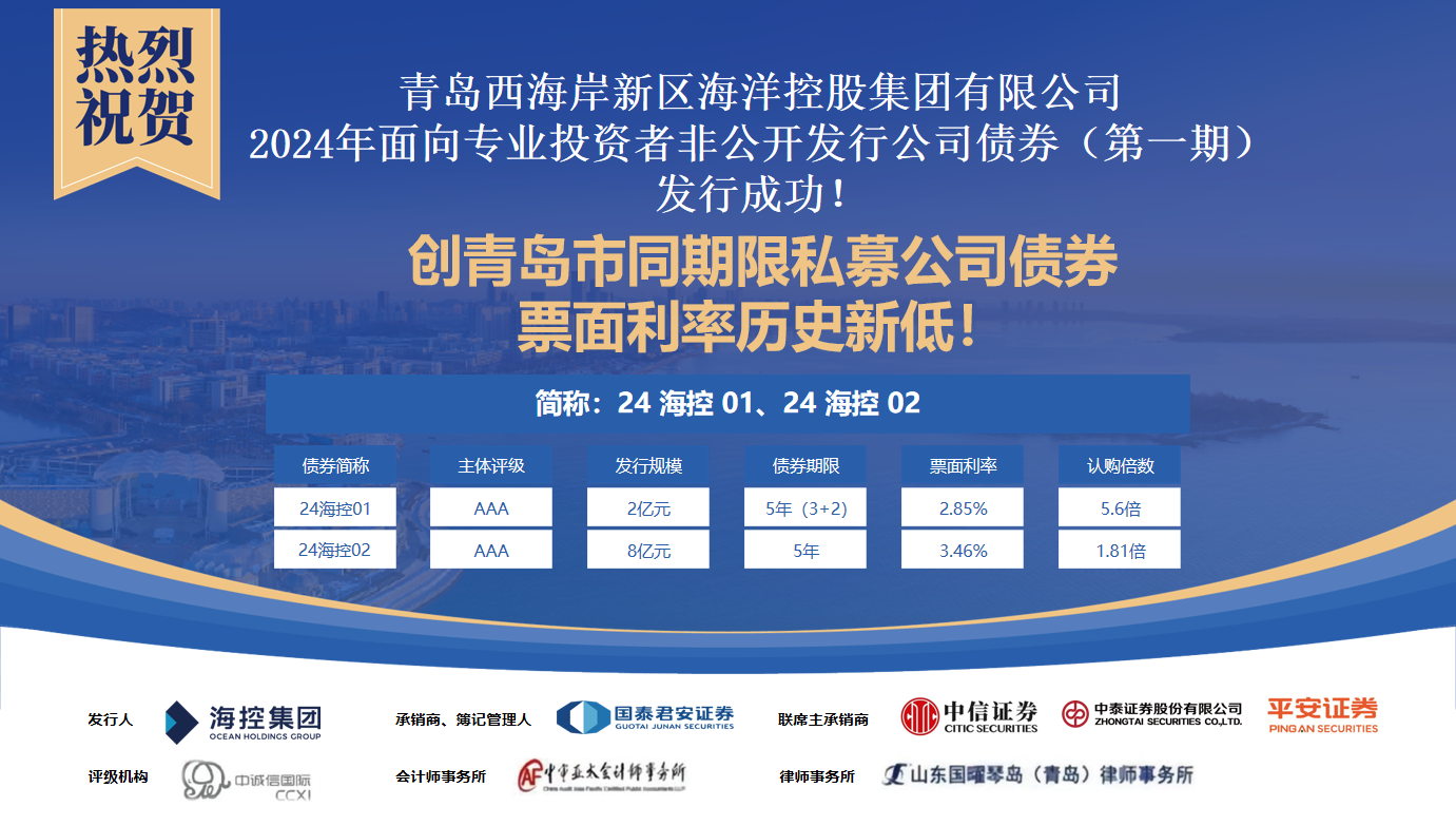 本次債券發(fā)行分為兩個(gè)品種,其中“24海控01”發(fā)行規(guī)模2億元,票面利率2.85%,期限為3+2年;“24???2”發(fā)行規(guī)模8億元,票面利率3.46%,期限為5年。上述品種票面利率均為青島市同期限私募公司債券歷史最低水平。
