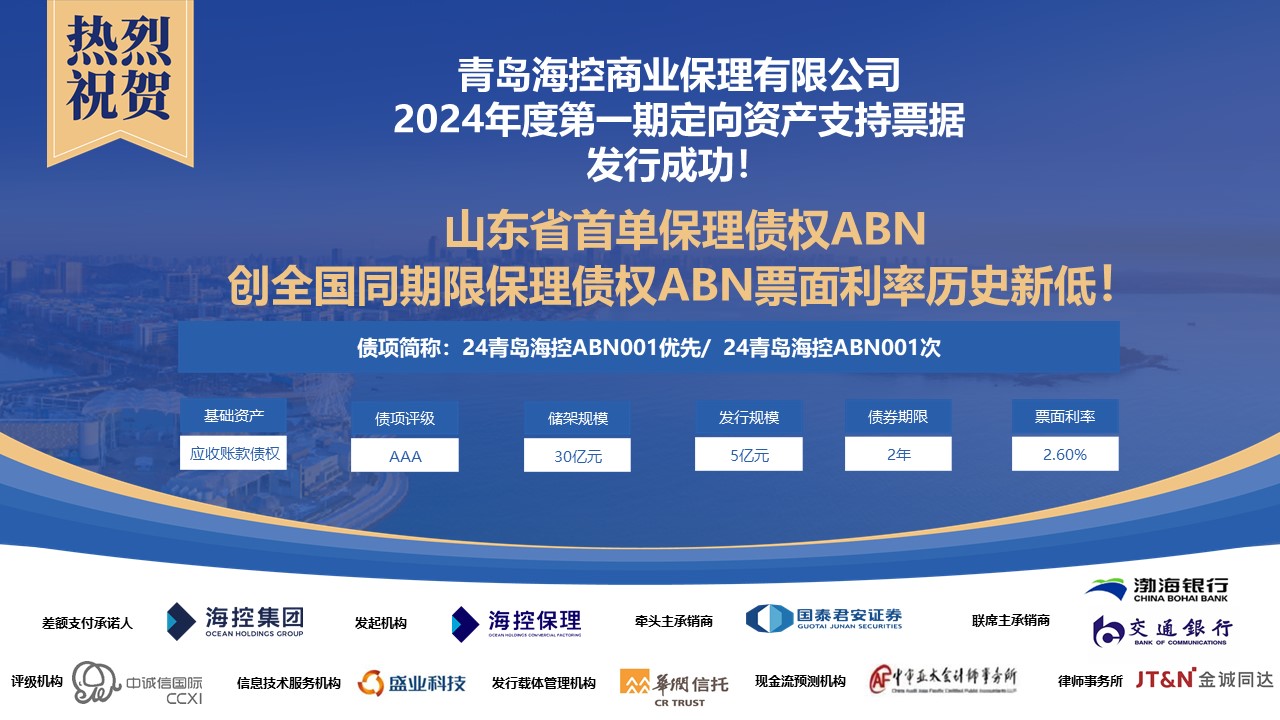 6月18日,青島??厣虡I(yè)保理有限公司(以下簡稱“??乇@怼保?024年度第一期定向資產支持票據(jù)(ABN)成功發(fā)行,是山東省首單保理債權ABN。該產品發(fā)行規(guī)模5億元,期限2年,票面利率2.6%,創(chuàng)全國同期限保理債權ABN票面利率歷史新低。